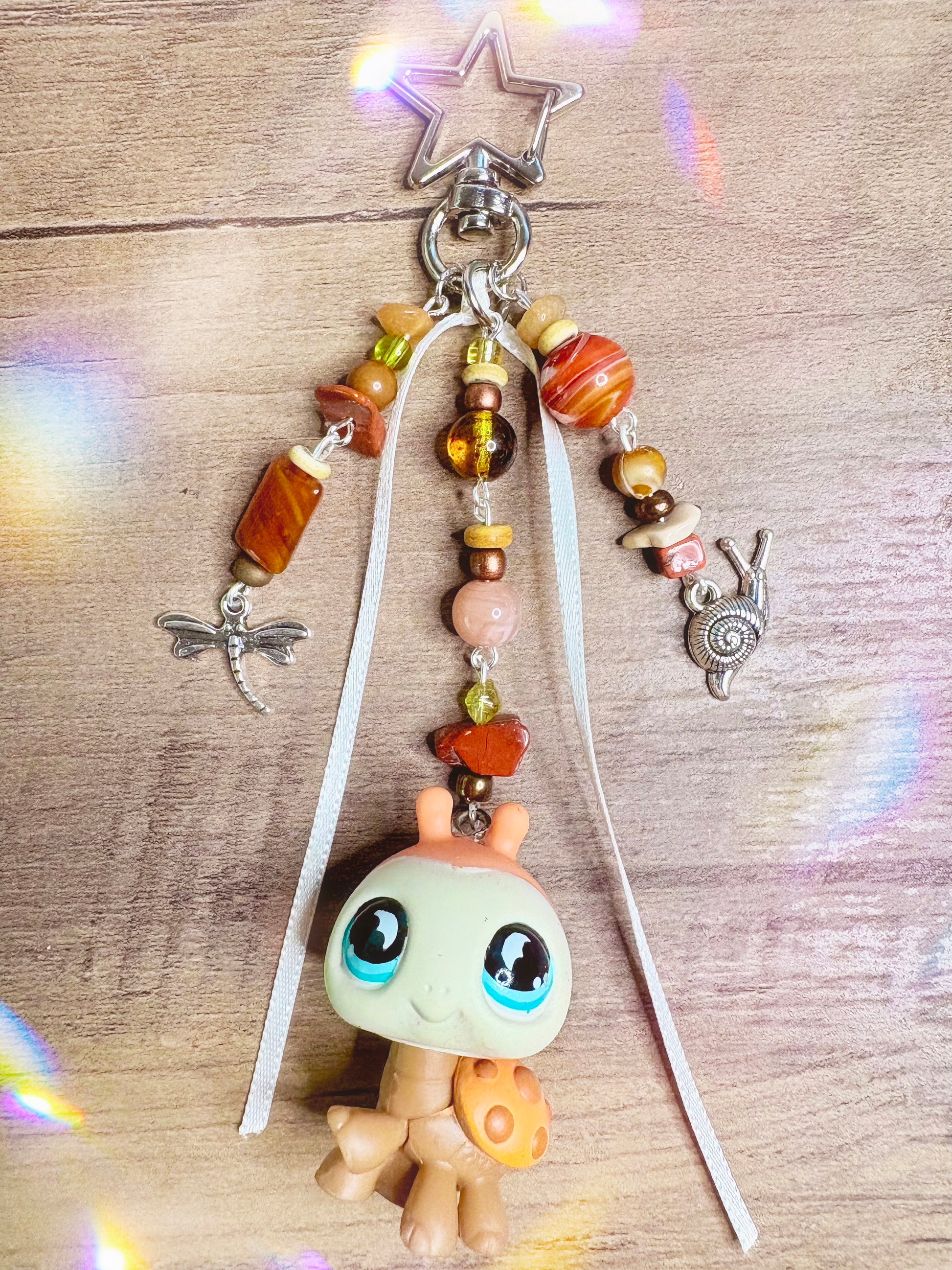 Cute silver star clasp keychain with various beads, silver charms, and an upcycled littlest pet shop trinket!