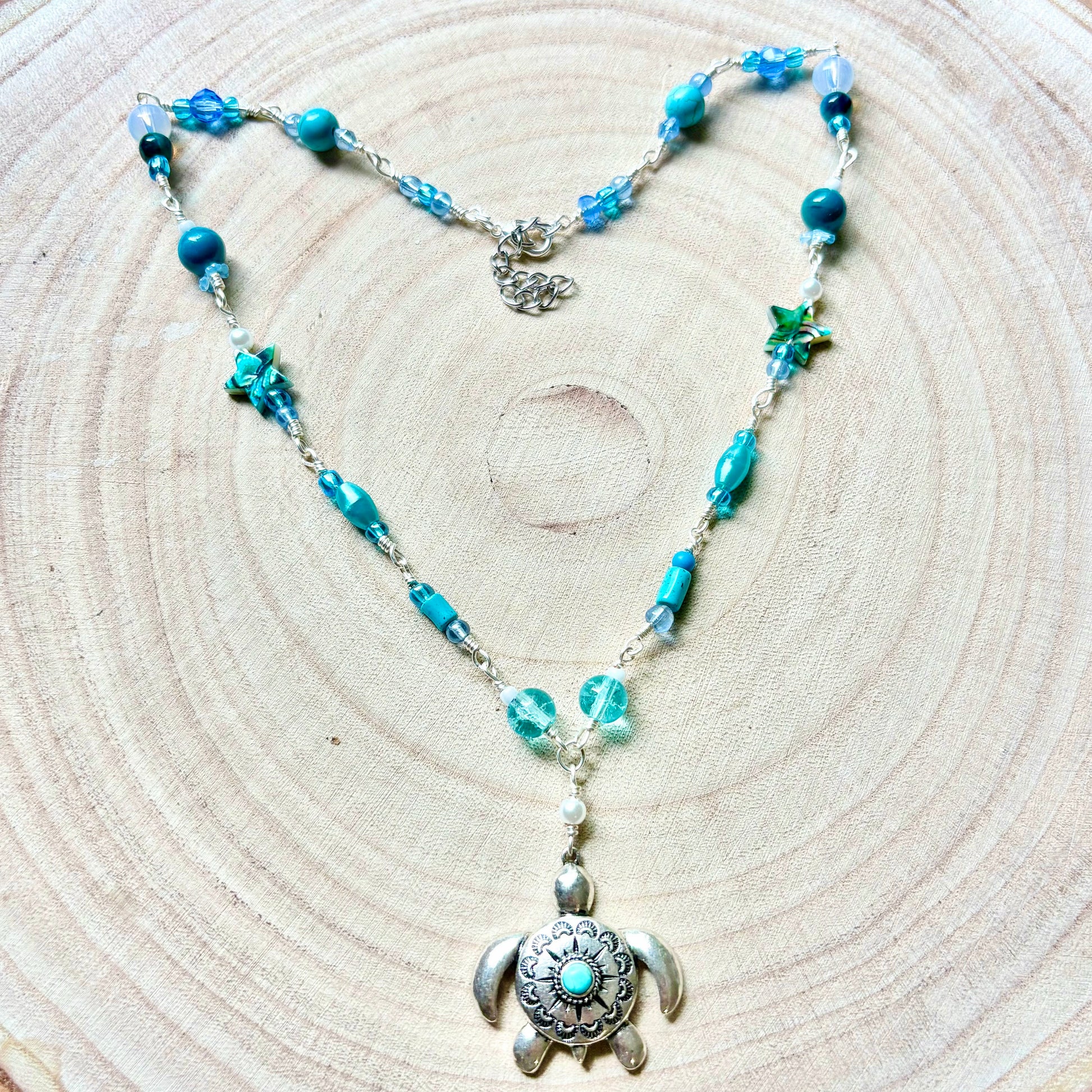 Blue and silver plated beaded turquoise turtle beach themed necklace