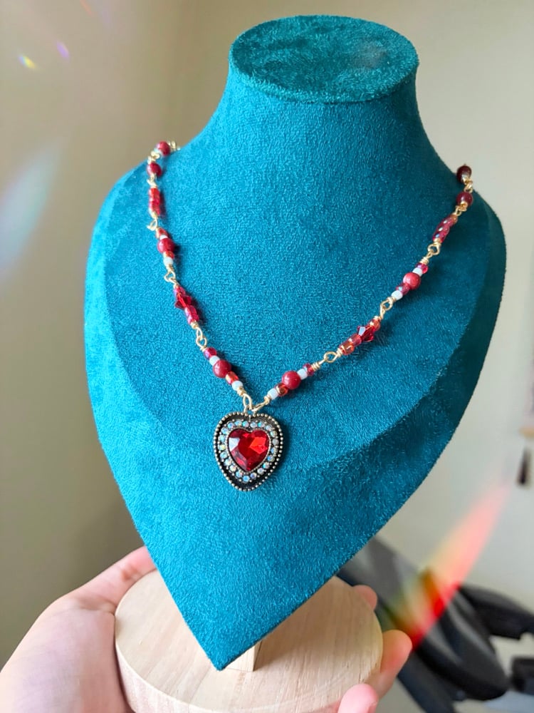 Queen of Hearts - gold plated wire wrapped beaded coquette necklace