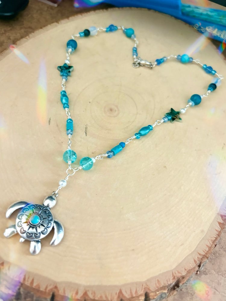 Blue and silver plated beaded turquoise turtle beach themed necklace